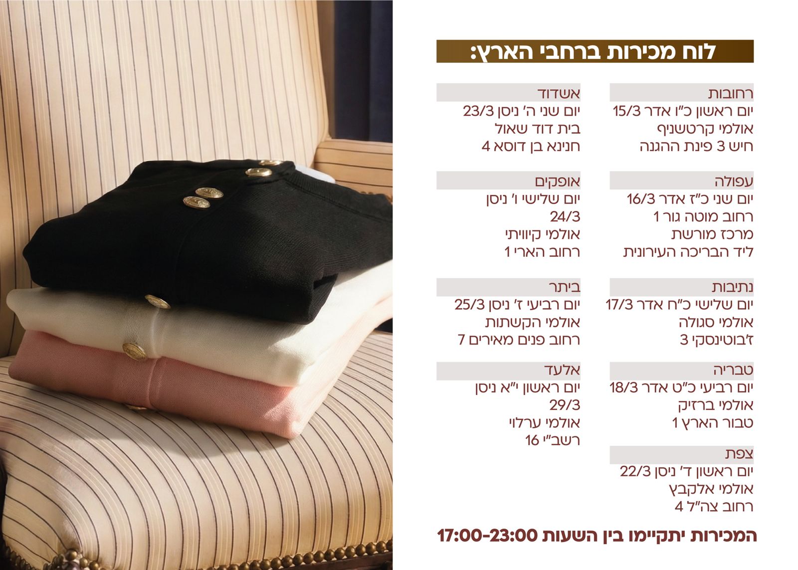 בכל עונה אנחנו מגיעות לערים מרכזיות בארץ, כדי לאפשר לך לפגוש מקרוב את הקולקציה החדשה, להרגיש, למדוד ולהתאהב.